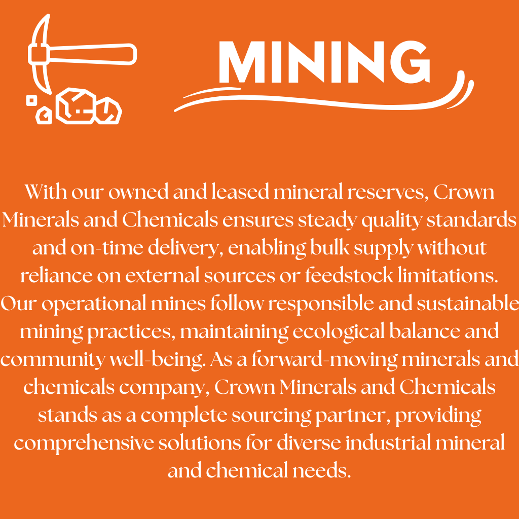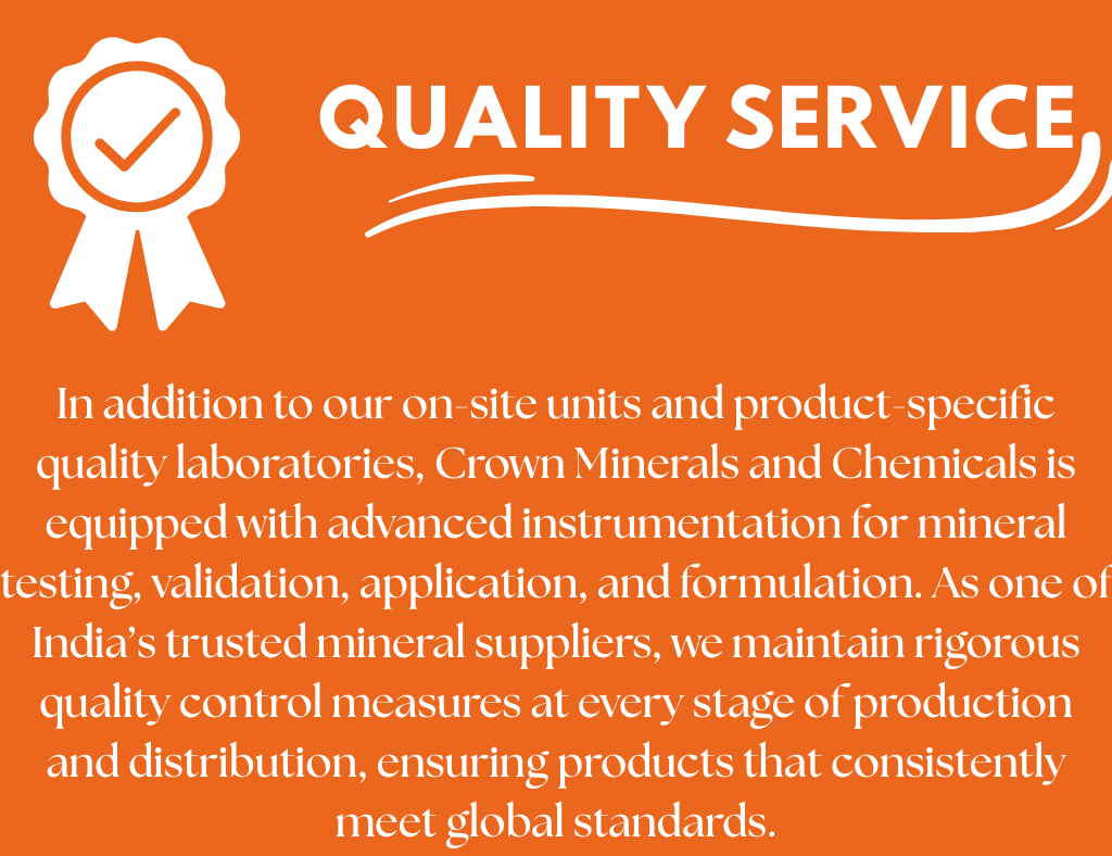 With our extensive network and deep technical expertise, Crown Minerals and Chemical goes beyond the role of a conventional mineral supplier — we are solution providers for industries dependent on mineral-based raw materials. Our commitment to quality, reliability, and innovation continues to define us as a trusted force in India’s mineral manufacturing sector.